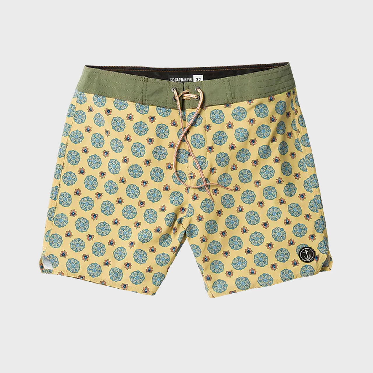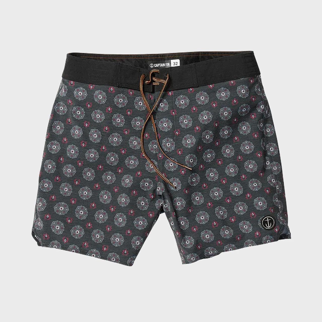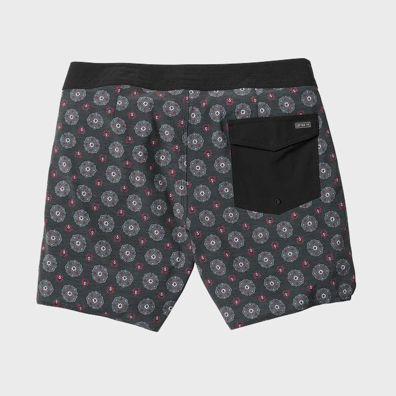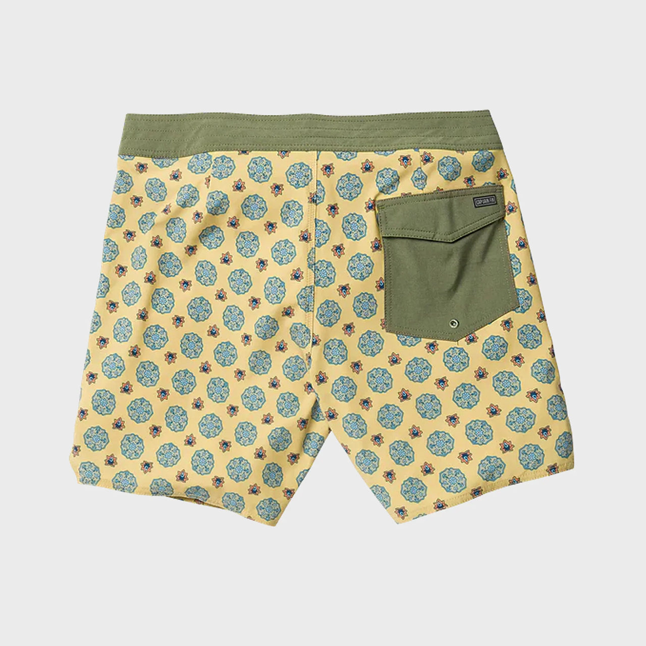 17インチのプリントボードショーツ、フラップ付きパッチバックポケット、脚の外側の下部にスリット入り、左脚にパッチロゴ