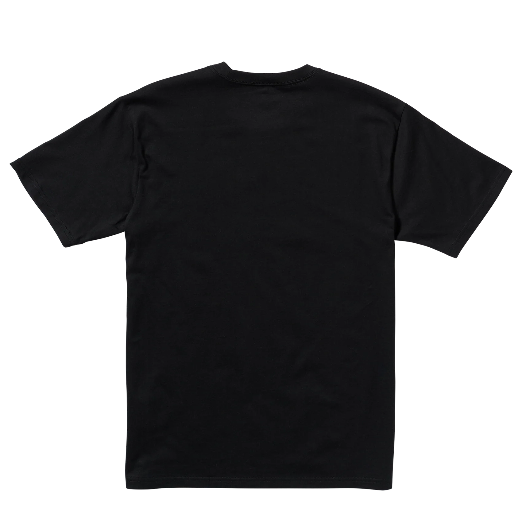 100%コットンのブラックTシャツは、ベーシックなフィット感、柔らかなハンドスクリーンプリントのデザイン、そして首元の内側のラベルが特徴で、ワードローブに欠かせない万能アイテムです。